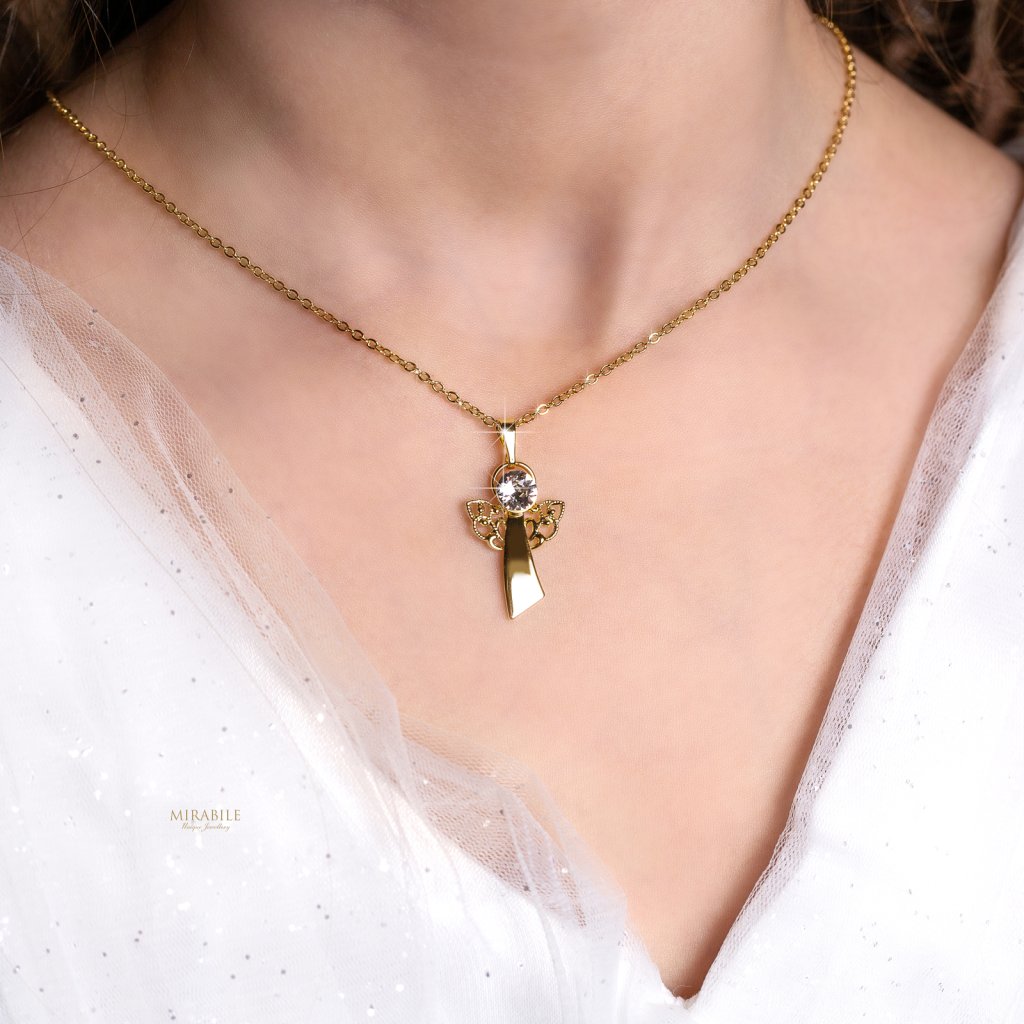 Nádherné prevedenie prívesku v tvare anjela v dvoch farbách, ktorého hlavičku zdobí číry krištáľ Swarovski.