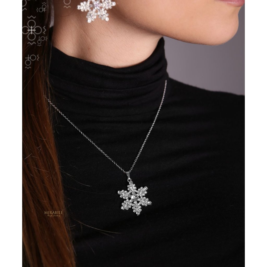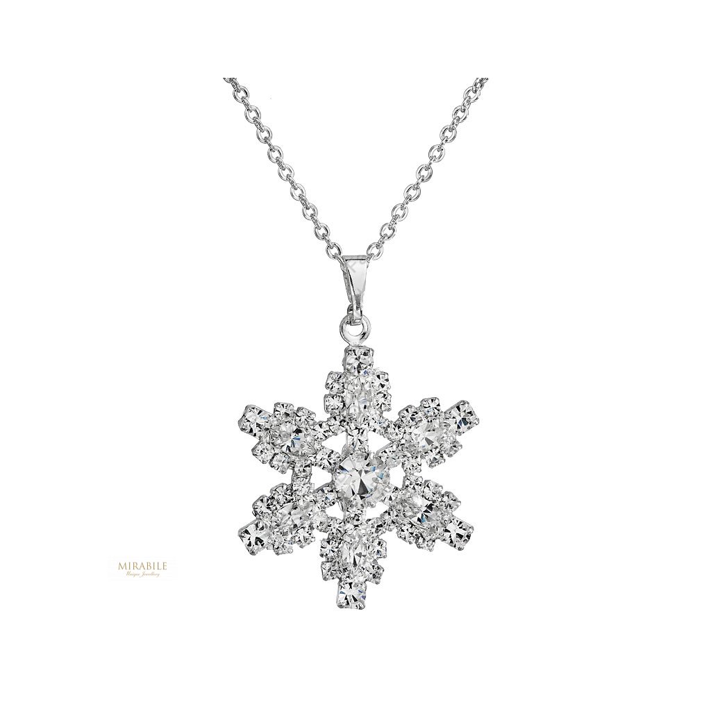 Trblietavý prívesok s motívom snehovej vločky. Veľkosť motívu je 4 x 3 cm. Dĺžka retiazky je 42 cm, ktorá má na konci predlžovaciu retiazku s dĺžkou 7cm. Náhrdelník si tak môžete nastaviť presne podľa vašich potrieb. Náhrdelník je v povrchovej úprave Rhodium, ktorá zvyšuje jeho životnosť a je antialergénna.