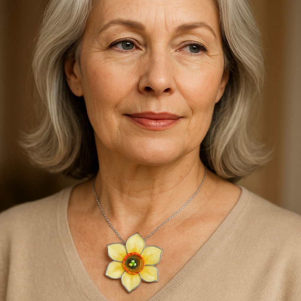 Symbolický, ručne vyrábaný náhrdelník Narcis zachytáva prvé jarné lúče a záplavu žltých kvetov, ktoré prebúdzajú prírodu. Kvet narcisu je symbolom naděje, nových začiatkov a čistej radosti - jeho žiarivá farba rozsvieti každý outfit.