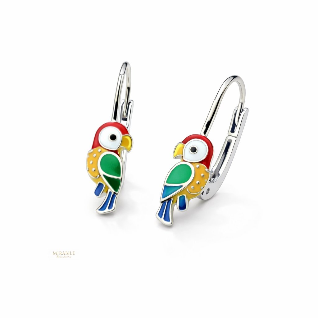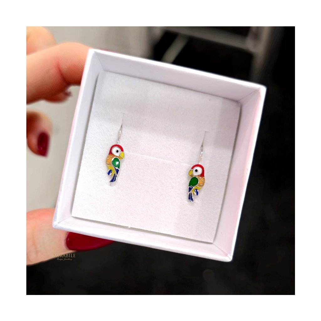 Veselé detské náušnice v tvare papagája si zamilujú malé aj väčšie deti. Detailne spracovaný motív je zdobený farebným smaltom v žiarivých odtieňoch červenej, žltej, zelenej a modrej, ktoré pôsobia hravo a optimisticky.