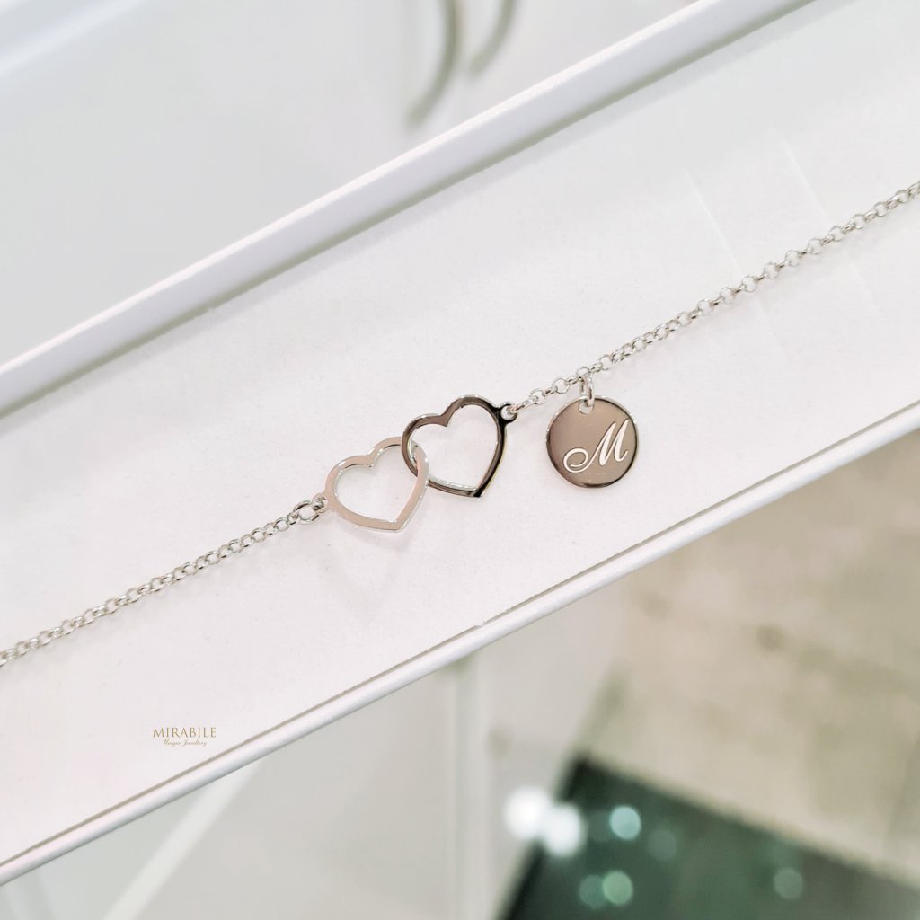 Moderný jemný náramok s dvoma obrysmi prepojených srdiečok, ktoré symbolizujú večnú lásku.