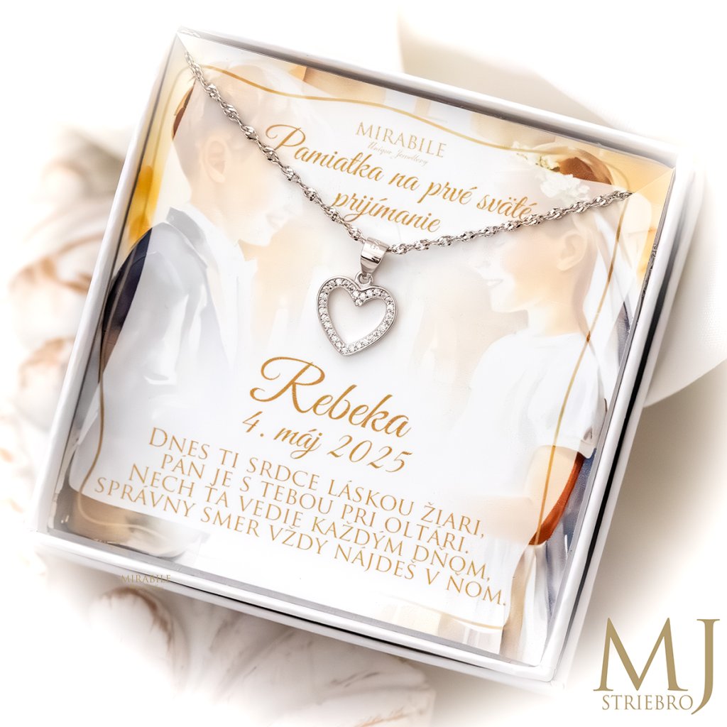 Symbol nežnosti, čistoty a lásky – klasický strieborný prívesok v tvare jemného obrysu srdca, zdobený drobnými čírymi kamienkami, je dokonalým darom pri príležitosti prvého svätého prijímania. Ľahký a elegantný šperk, ktorý nesie v sebe hĺbku duchovného odkazu aj vkusný dizajn vhodný pre malé slečny aj dospelé ženy.