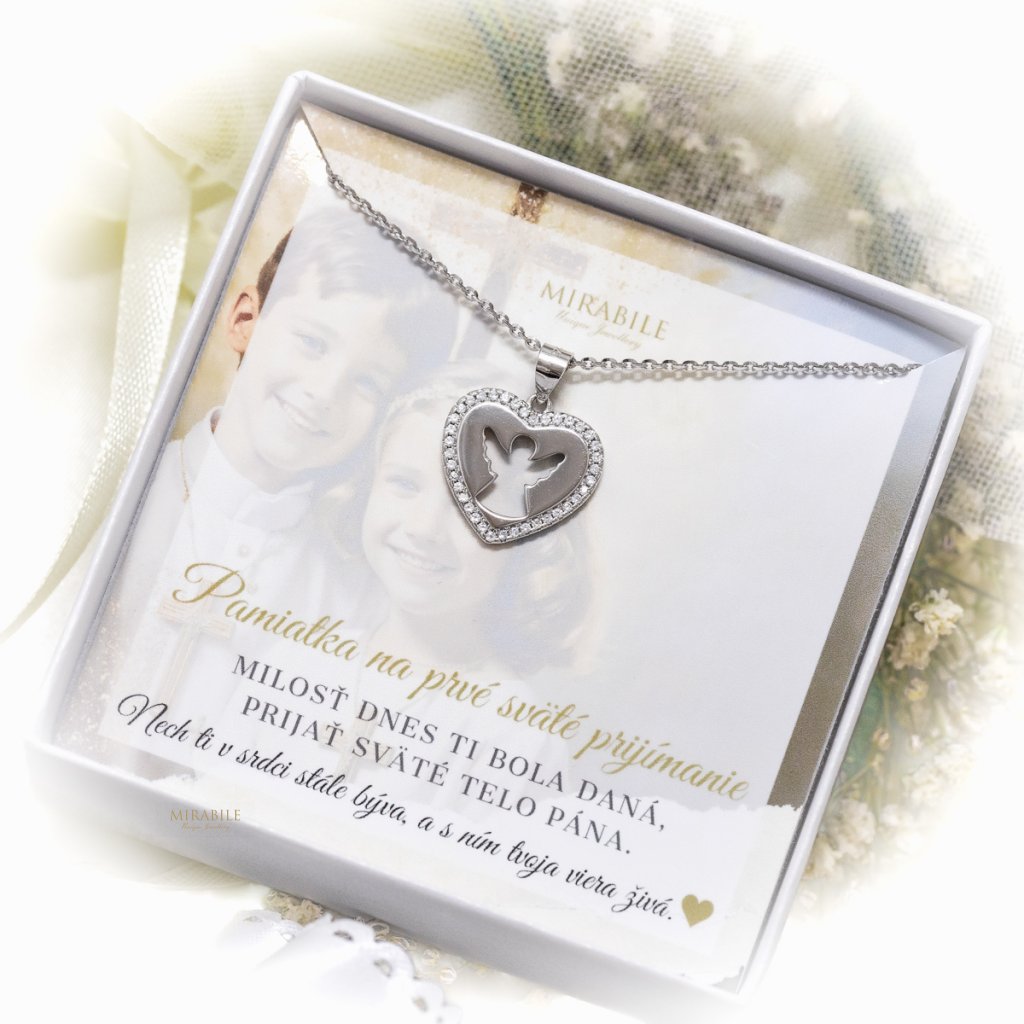 Krásna pamiatka na veľký deň prvého svätého prijímania, v podobe strieborného prívesku v tvare srdca, so symbolom obrysu anjela.