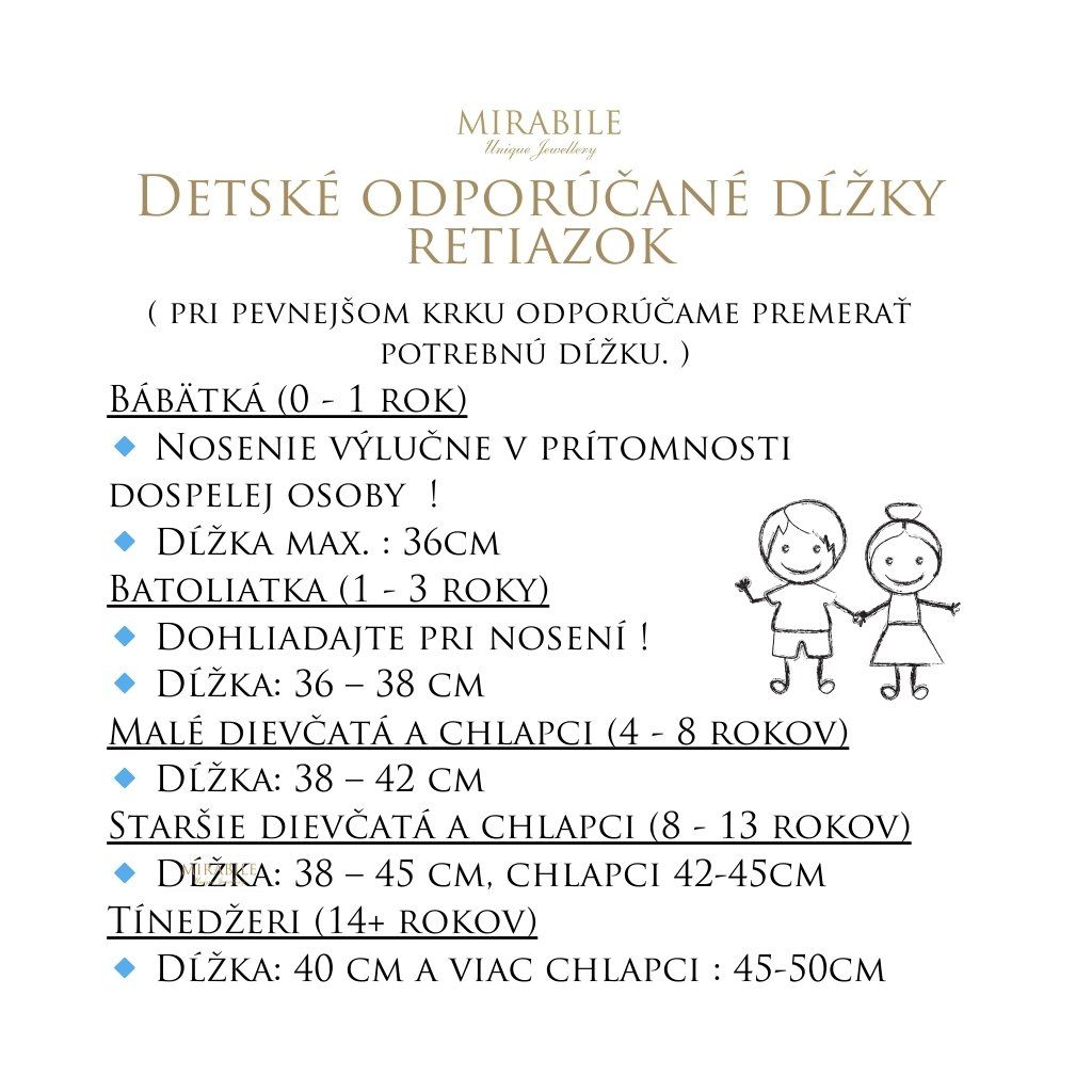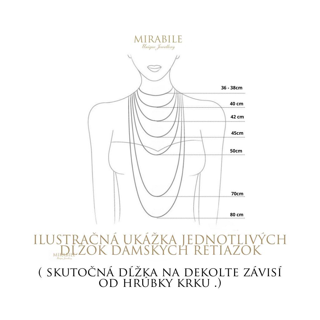 Štandardne platí pri dámskych/detských dĺžkach- veľmi tenký krk : 36, 38, 40cm, tenký krk : 40,42cm, štandardná dámska dĺžka : 45cm, pevnejší krk : 50,55cm, veľmi pevný krk : 55,60cm