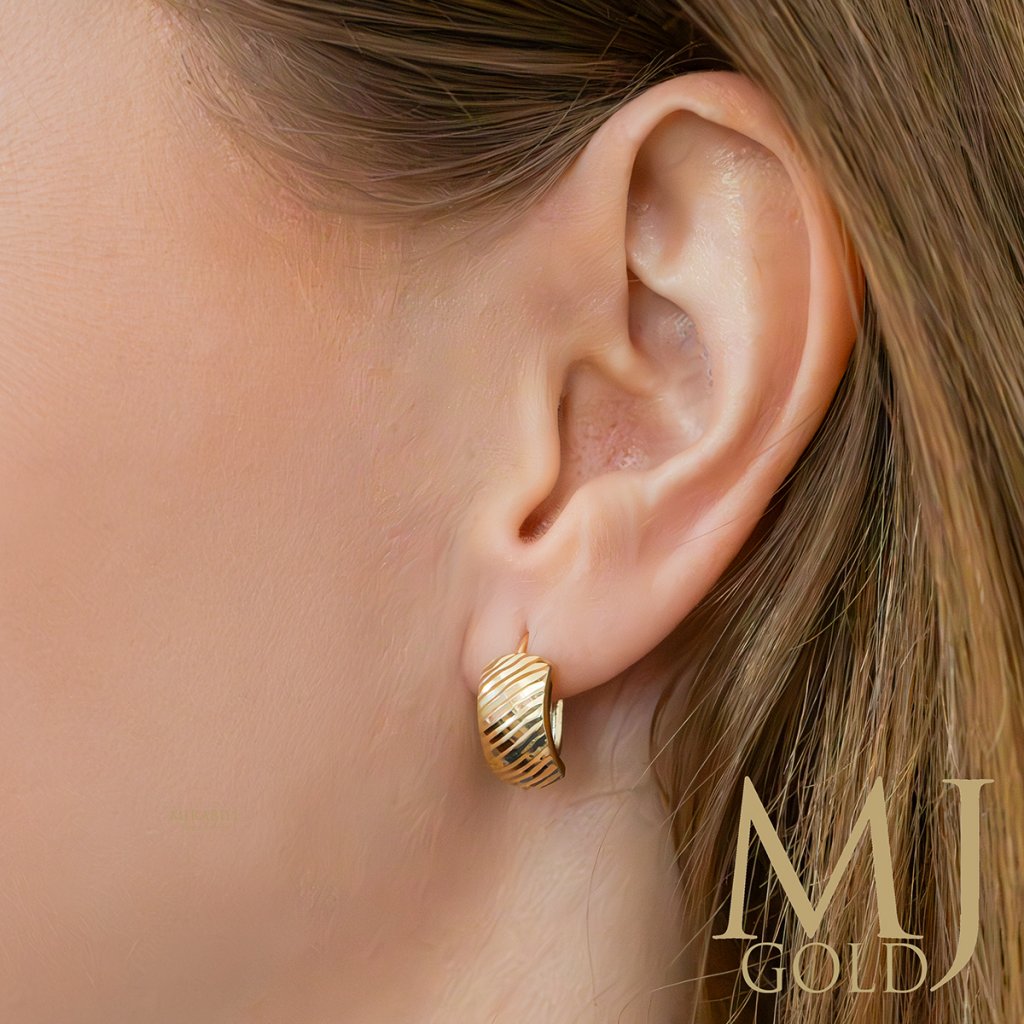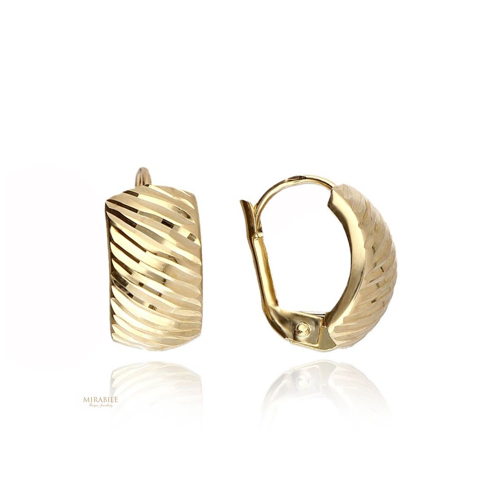 Tieto elegantné zlaté patentové náušnice sú ideálnym doplnkom pre ženy, ktoré milujú klasický šperk s nádychom originality. Ich povrch zdobí jemné gravírovanie v tvare oblúčikov, ktoré krásne odráža svetlo a dodáva náušniciam luxusný lesk.