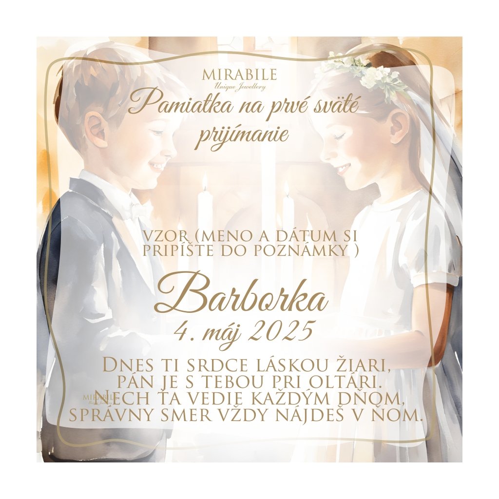 Dodávané v elegantnej darčekovej krabičke s personalizovaným textom a citátom k sviatosti . Meno, dátum a názov sviatosti si uveďte do poznámky pri objednávke.