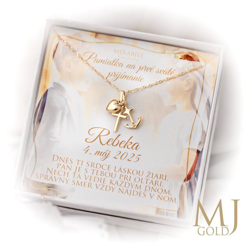 Tento nádherný zlatý prívesok je symbolom troch najdôležitejších kresťanských hodnôt – viery, nádeje a lásky. Kotva, kríž a srdce predstavujú duchovnú silu a spojenie s Bohom. Prívesok je vhodný ako symbolický dar na prvé sväté prijímanie, birmovku alebo krst.